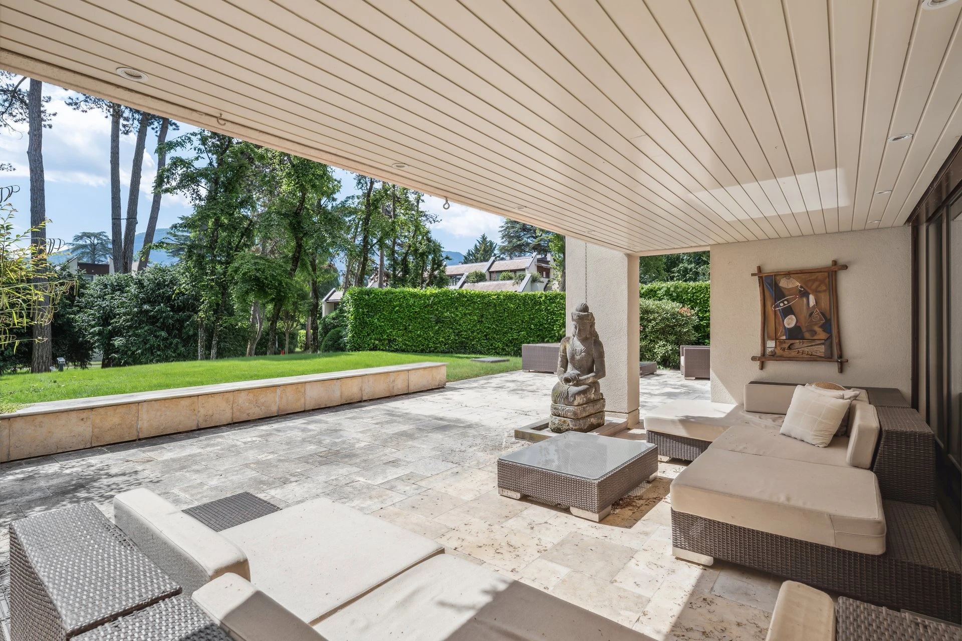 Superbe villa contemporaine de 385m² sur un terrain de 1250m² dans le quartier résidentiel de la Plaine. Cette propriété d'exception offre une vue imprenable sur le lac Léman et les montagnes. Caractéristiques principales : entrée majestueuse, grand séjour avec cheminée et accès à la terrasse de 105m², cuisine professionnelle entièrement équipée, bureau, 4 chambres à coucher dont une suite parentale avec dressing et salle de bains en marbre, 3 autres salles de bains, sauna, cave à vin, garage double, jardin paysager de 850m². Domotique complète, système de sécurité, panneaux solaires et pompe à chaleur. À 5 minutes du centre-ville et des écoles.